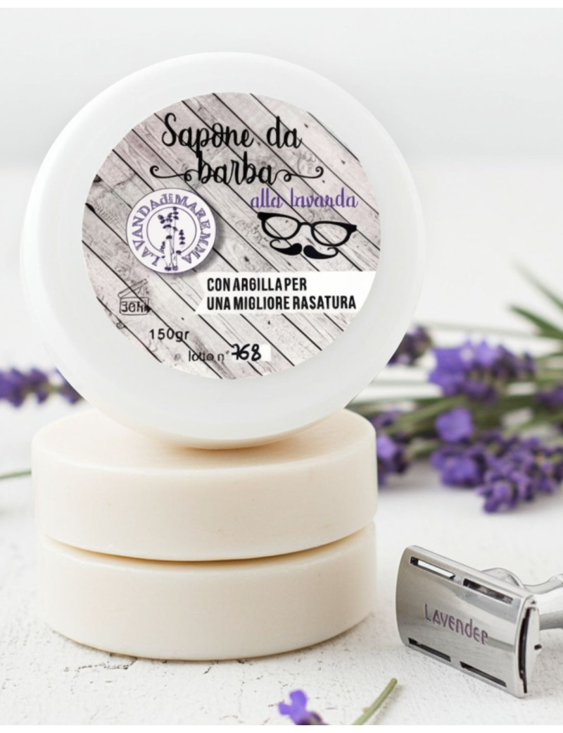 Excellent moisturizing brush soap, soothing for irritable skin; thanks to the clay it allows an excellent sliding of the blades. It only takes a few seconds to create a good shaving foam with a damp shaving brush. ALL OUR SOAPS ARE HANDMADE produced with the cold method and aged for at least one month. The main ingredient is olive oil which makes them excellent quality soaps, with emollient and curative properties; they protect and let the skin breathe, allowing for natural hydration. The presence of lavender essential oil helps purify the skin thanks to its antiseptic effect, preventing acne and keeping it smooth and clean.