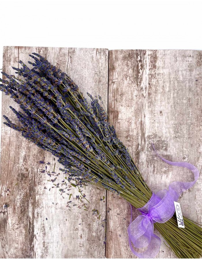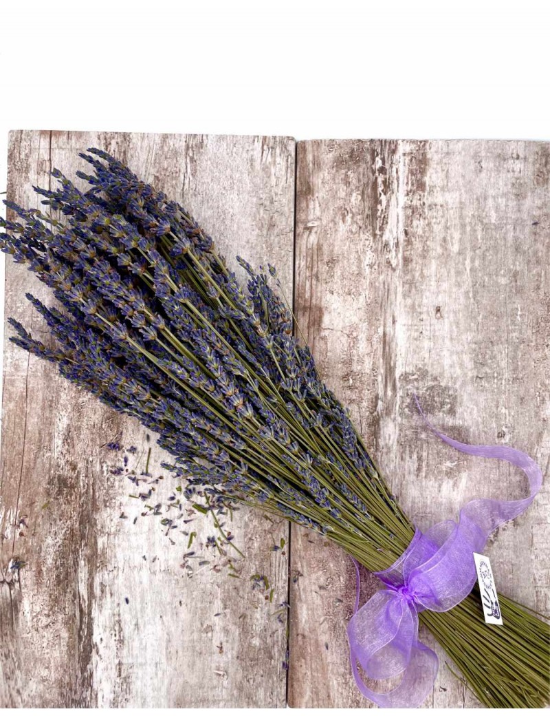 Bunches of Lavender from organic cultivation. Choose lavender for your bouquet or to set up your banquet. The fresh bouquets are available from June 20th for about a mont. You will find the best color in the first 15 days of flowering. Naturally dried bouquets, without the use of dyes or synthetic products, are available all year round while stocks last. Ideal for beautifying and perfuming the home, they keep their beautiful blue color even after some time. A bouquet consists of about 250 sprigs of Lavender.