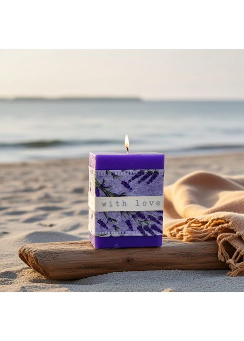 Candele artigianali con olio essenziale di lavanda e decorate a mano.