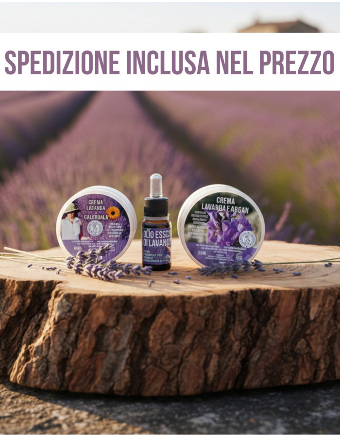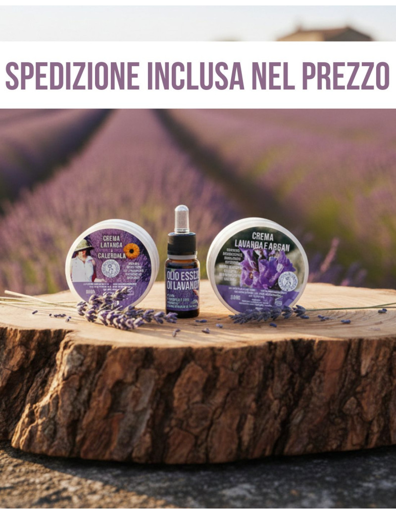 Include la Crema Argan per idratare in profondità e la Crema Calendula per lenire e curare la pelle sensibile. Kit completo di Olio Essenziale Puro per l'aromaterapia. Filiera corta garantita